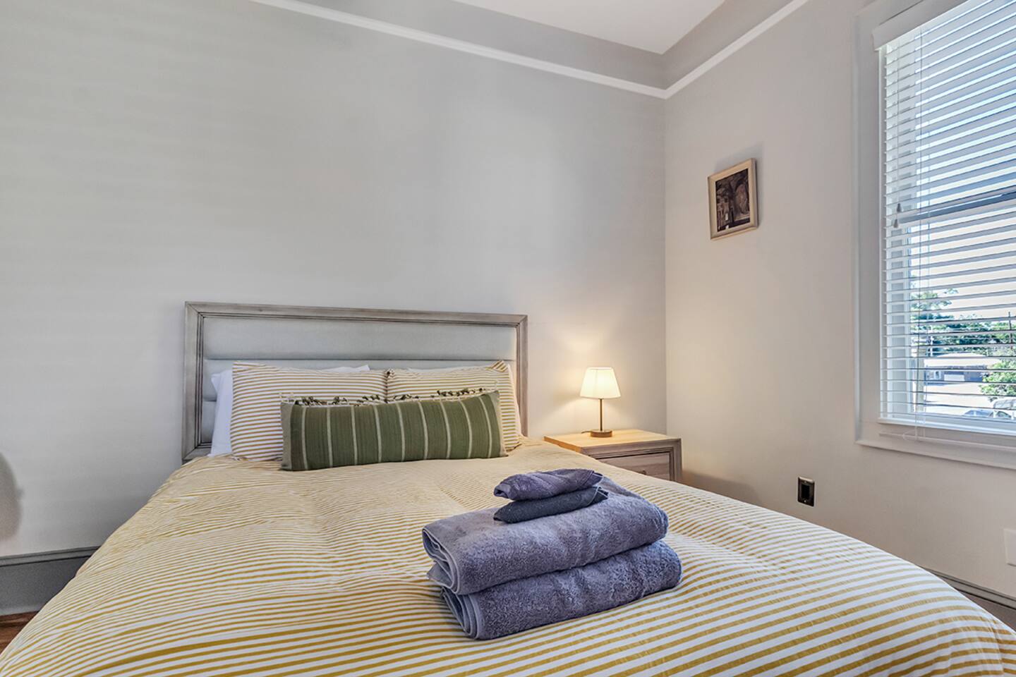 **The Space** Welcome to this beautifully renovated upper-level unit, a true gem in a historic property that blends timeless charm with modern comfort. Boasting two spacious bedrooms, each outfitted with cozy queen beds, this unit is ideal for families, couples, or small groups looking to explore and unwind. For extra guests, a convenient queen-size auto-inflate airbed is available—just bring your own linens. The fully-equipped galley kitchen provides everything you need to prepare meals, from quick breakfasts to hearty dinners. The adjacent living and dining areas offer plenty of space to gather, relax, and share the highlights of your day. Step outside to enjoy not one but two private outdoor spaces: a charming veranda where you can sip your morning coffee while overlooking the neighborhood and a sundeck perfect for soaking up the sun or enjoying an evening under the stars. These outdoor areas provide a peaceful retreat from the bustle of the city. Two full bathrooms ensure everyone has their own space to refresh, and the inclusion of a washer and dryer makes long stays a breeze. The thoughtful renovation preserves the home’s historic character while incorporating modern updates, offering the best of both worlds. Whether you're in town for sightseeing, a special event, or simply to relax, this spacious and stylish unit is the perfect home base for your stay.