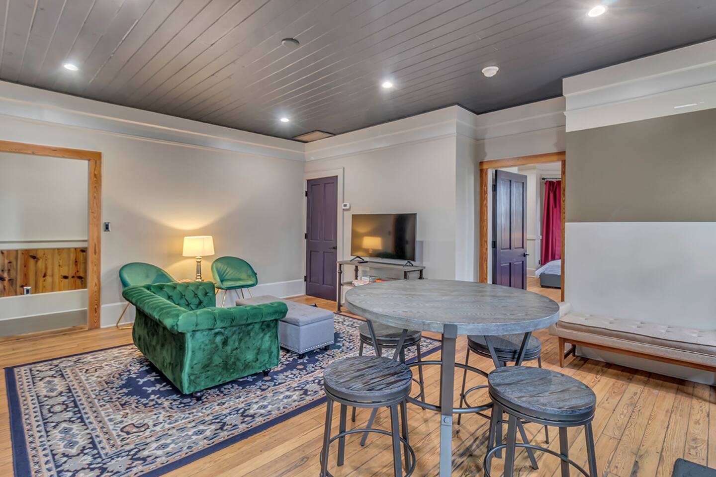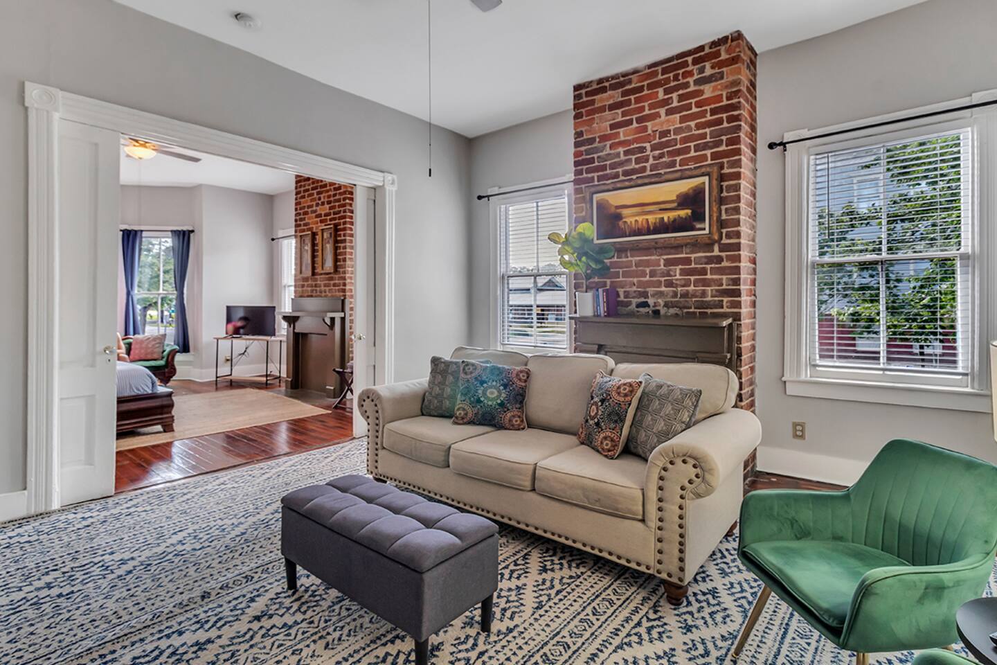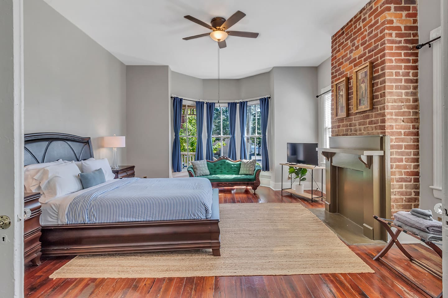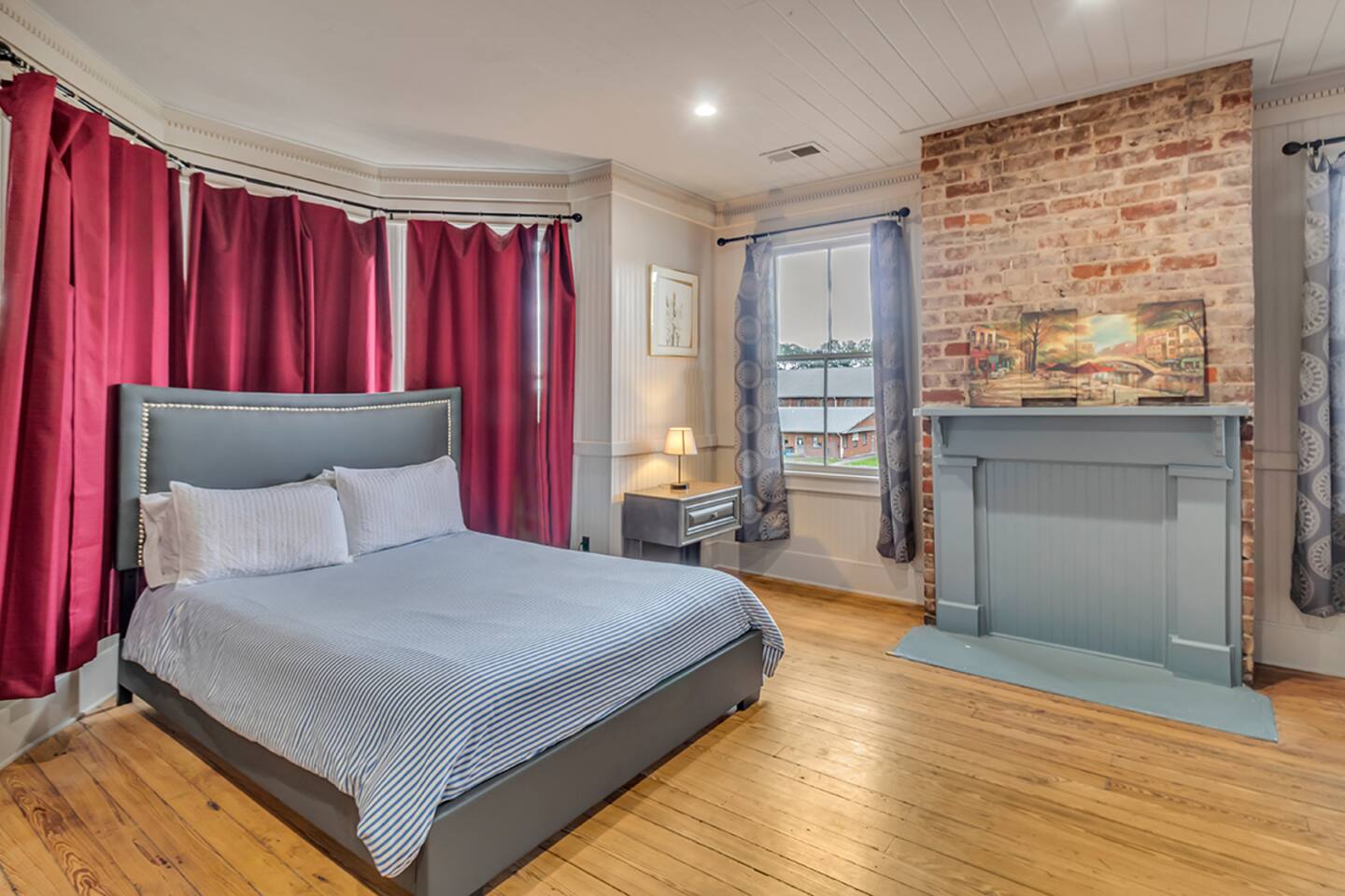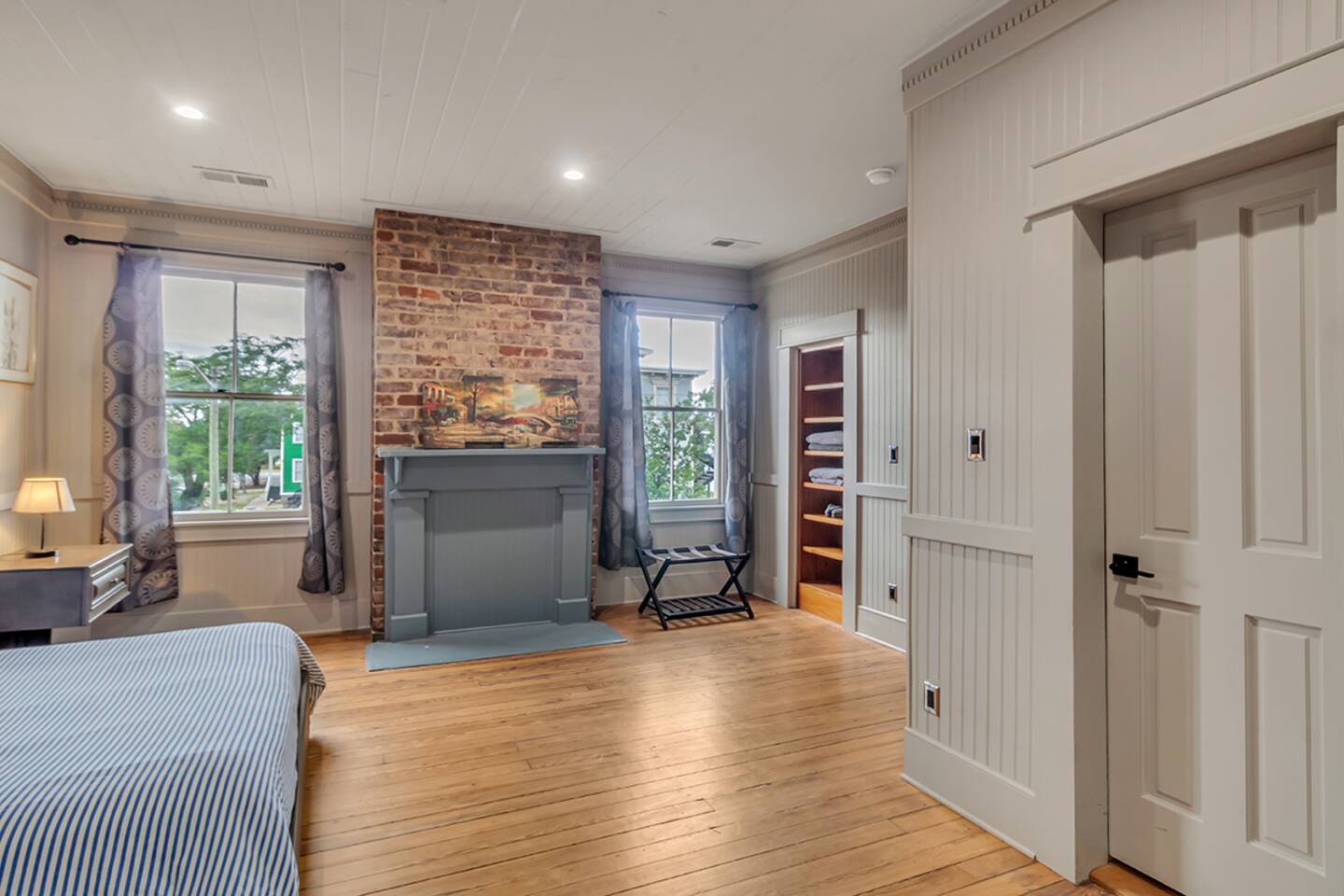 Welcome to the left-side townhouse at The Dueling Sisters Inn — a spacious, story-soaked Savannah home built in mid 18th century and once the heart of the city's most legendary sibling rivalry. With four bedrooms, three bathrooms, two kitchens, porches on both levels, and a private courtyard, this entire home is yours — the perfect setup for group getaways, wedding weekends, family retreats, or girls' trips filled with porch wine and laughter. The home was originally gifted by a wealthy cotton merchant to his twin daughters, Mildred and Myrle. Rather than choose a favorite, he built them two identical townhouses, side by side, so neither could claim the better half. Mildred, the older by three minutes, was known for her quiet routines, impressive baking skills, and merciless judgments — all served with a side of tea and rose garden pride. Myrle, who claimed the left side of the house, was the spirited sister — known for her porch parties, champagne habits, and scandalous serenades drifting out into the night air. Today, guests staying on the left side still feel echoes of Myrle’s warmth and flair. The home now consists of two fully separate floors, each with its own entrance, bedrooms, bathrooms, kitchen, and living spaces — ideal for groups who want to be together but still enjoy privacy and flexibility. Upstairs, you'll find two queen bedrooms, each with its own private bathroom, a full kitchen, a cozy living room, and a lovely front porch perfect for morning coffee or late-night toasts. Downstairs offers two more queen bedrooms, a full bathroom, a second kitchen and dining area, a screened-in front porch, and direct access to the shared fenced courtyard, where laughter still seems to linger. The home features original hardwood floors, vintage details, central air and heat, fast Wi-Fi, and flat screen TVs and living space. It’s not new or fancy — it’s historic and full of character. You may notice a creaky floorboard or a slightly stubborn door, but that’s all part of the charm. It’s clean, comfortable, and full of Southern soul. Some guests swear Myrle still visits — a flicker of light here, a missing sock there, or the faintest trace of gardenia and gin. We make no promises… but we do suggest keeping her happy with good company and a little something left on the porch. Your stay is cared for by Miss Stacy, our beloved housekeeper and part-time ghost negotiator. She’s been with us for years and takes great pride in keeping the home tidy and welcoming — despite Myrle’s occasional pranks. She may stop by to restock supplies, but otherwise, you'll have full privacy and space to enjoy. The home is located just two blocks from Forsyth Park, on a quiet, oak-shaded street in Savannah’s Historic District. You’re within easy walking distance to coffee shops, boutiques, brunch spots, and some of the city’s best bars and historic squares. Whether you're looking to explore the sights or simply relax with your group in a place that feels like a true Savannah storybook, this is your home base. Stay where the wild sister once lived, where secrets were shared over champagne, and where porches still invite long, easy conversations. Come for the space, stay for the soul — and maybe, just maybe, feel the sisters watching with a smile.